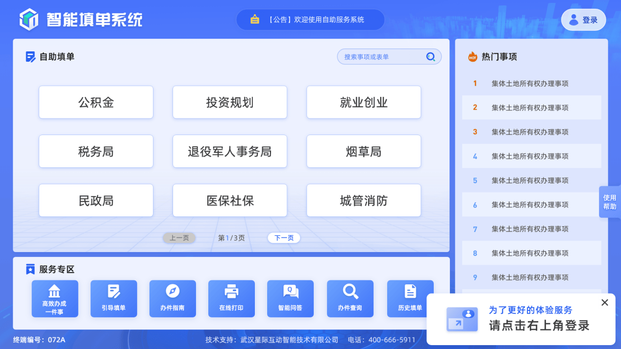 基于OCR取天然言语处置手艺,显著提拔表格填写效率取数据质量。依托数据可视化取景象系统,供给个性化、指导式办事,全面提拔办事的便利性取规范性。便利群众非接触式打点营业。无效延长办事时间,显著提拔查察办事核心的全体办事质量取效能。指导群众高效完成消息录入。